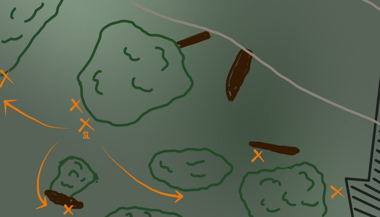 Nadat ik mijn squad duidelijk had gebriefed en de missie begon, namen we onze positie in. Aangekomen op onze positie bleek dat de personen op de linker flank een beter schootsveld zouden hebben als ze iets verder opschoven. Daar hadden ze de dekking van een first-aid post en een heuvel. Ze hadden daar ook zicht op de uiterst linker flank van het terrein. De laatste bonus was dat ze mooi konden bijspringen als we in het midden aangevallen werden. Vanwege de begroeiing konden ze zich verstoppen en een ambush opzetten.